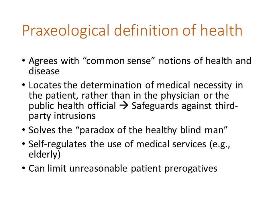 An important consequence of this praxeological interpretation of health is that it locates the determination of medical necessity within the patient, rather than in the physician or public health official, since only the patient knows what his or her chosen ends are. The definition can therefore safeguard against unwanted third-party intrusions in healthcare.