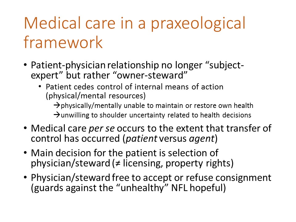 Let’s first note that the nature of the patient-physician relationship changes in the praxeological framework.