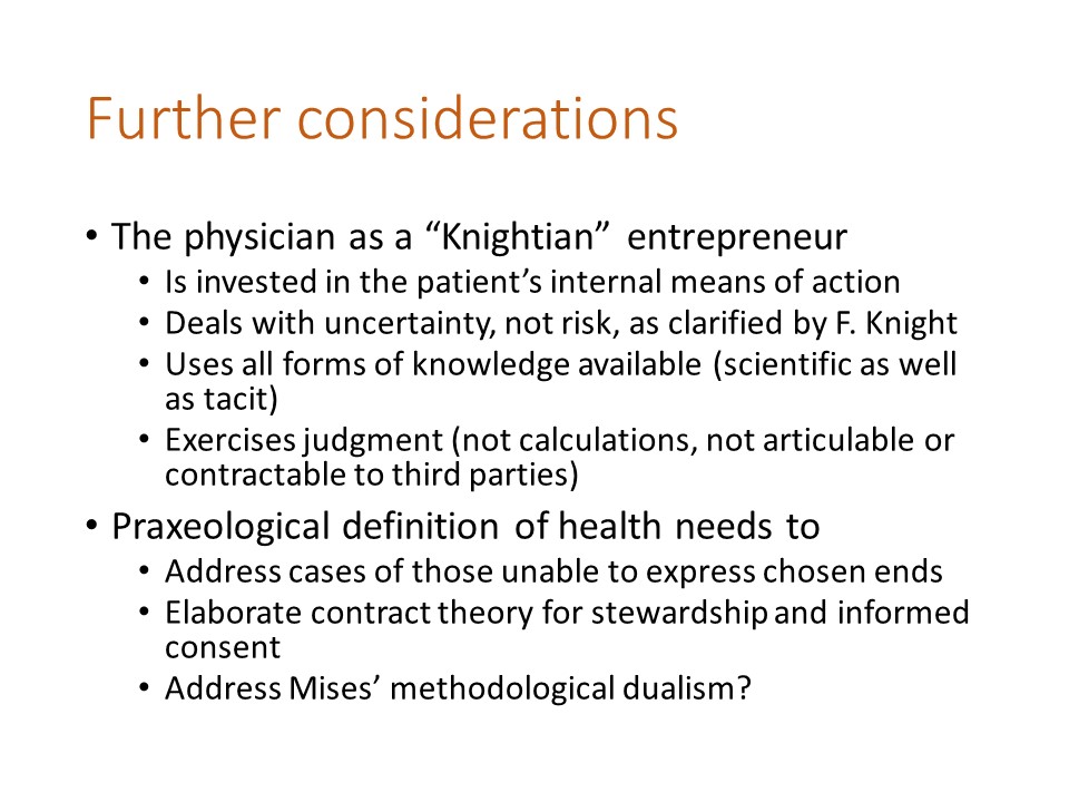 Finally, additional considerations that the Austrian theory of medicine must address include the cases of those unable to express chosen ends, the need to elaborate a contract theory for stewardship and informed consent, and probably the need to address Mises’ methodological dualism, since the connection between the physical sciences and medical care is close, and a sharp methodological separation may be counterproductive in the long term.
