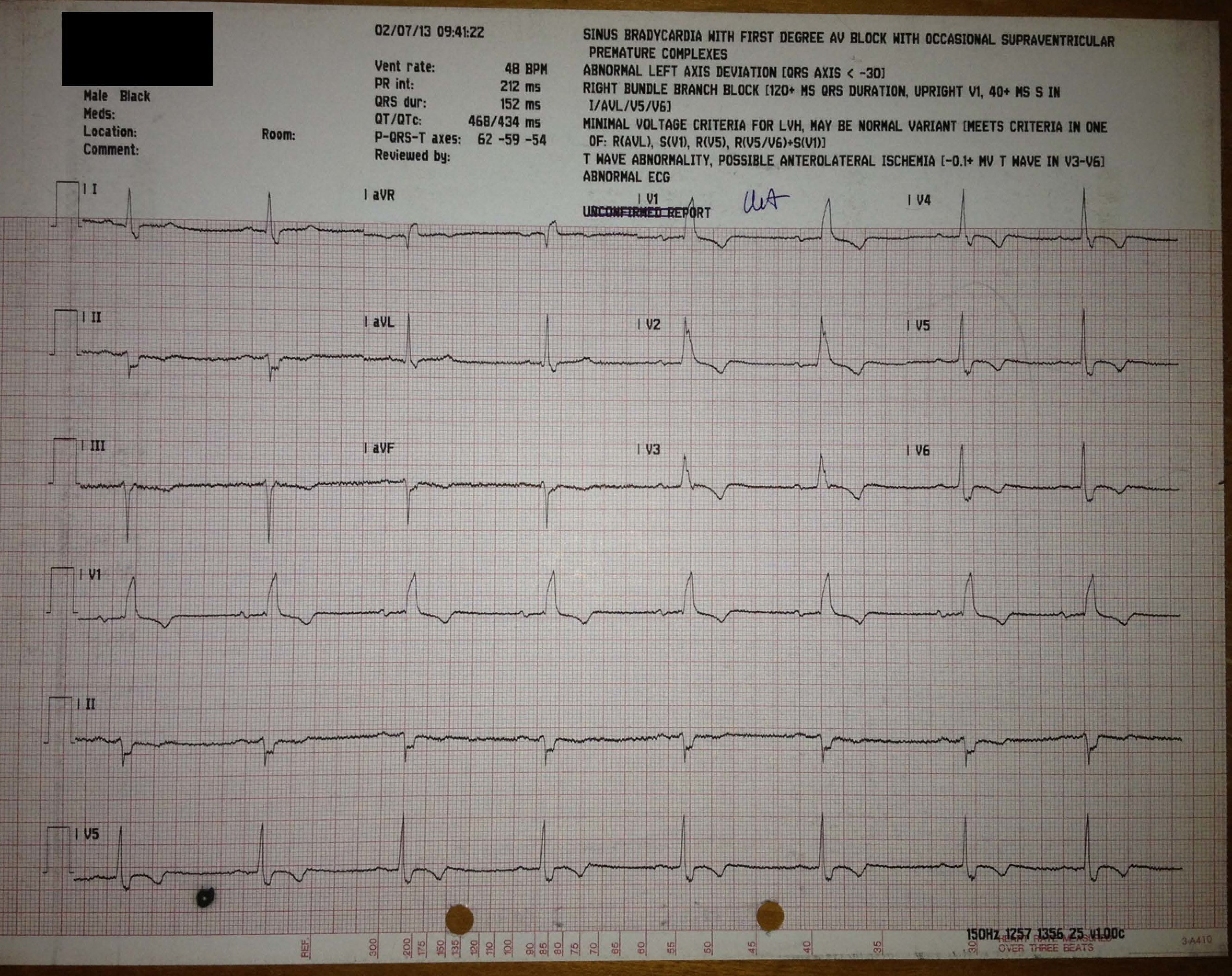 An ECG showed sinus bradycardia at 48 bpm, first degree AV block (PR = 212 msec), left anterior hemiblock, complete right bundle branch block, as well as significant anterolateral T wave inversions: